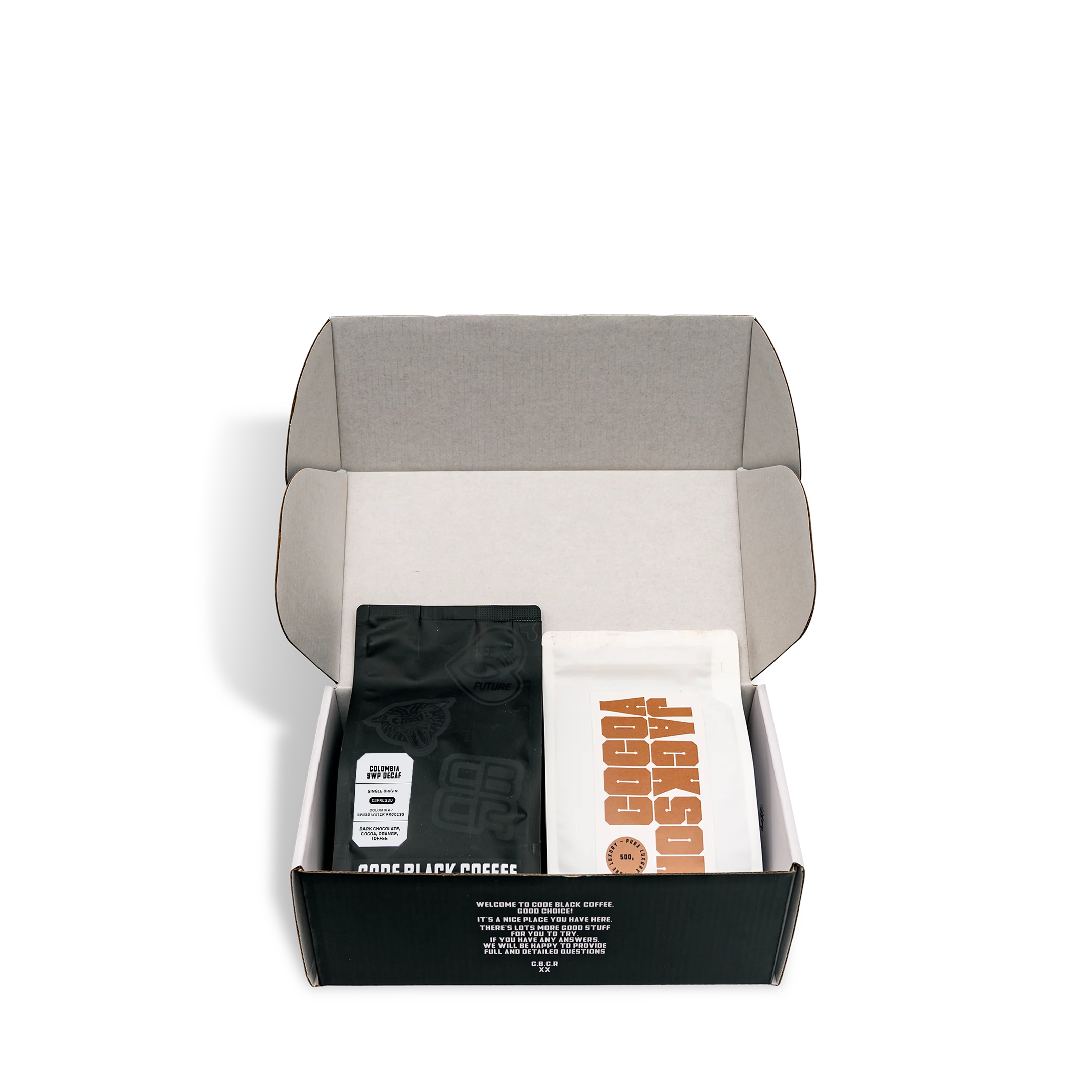 Code Black Coffee's Decaf x Hot Chocolate Bundle contains:
